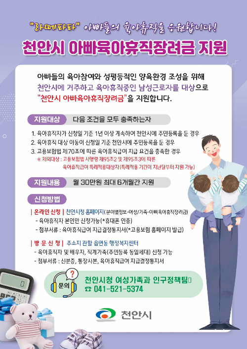 천안 아빠육아휴직장려금은 아버지가 육아에 적극 참여할 수 있도록 돕는 중요한 제도입니다. 아버지의 육아 참여는 가정의 행복과 아이의 건강한 성장에 큰 영향을 미칩니다. 육아휴직을 고민하고 있는 아버지들은 이 제도를 통해 경제적 지원을 받으며 육아에 참여해 보시기 바랍니다. 더 궁금한 사항은 천안시청 홈페이지를 방문하시거나, 관할 행정복지센터에 문의하시면 됩니다.