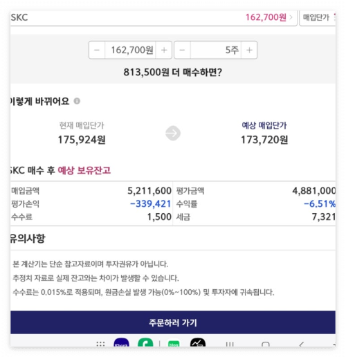 물타기 계산기는 주식의 평균 단가를 쉽게 계산할 수 있도록 도와주는 도구입니다. 사용법은 간단합니다. 현재 보유하고 있는 주식의 수량과 매입 단가, 추가로 매수할 주식의 가격과 수량을 입력하면 평균 단가가 자동으로 계산됩니다. 키움증권 계산기 기능에서 보유종목 추가매수수량을 작성하면 현재매입단가에서 예상 매입단가를 확인할 수 있어 미리 계산을 하신 후에 물타기를 실행하시면 도움이 됩니다.