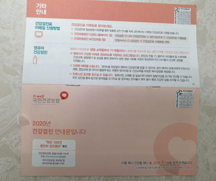 2년에 한 번씩 나라에서 해주는 건강검진이 있습니다. 주민등록 번호 끝자리가 홀수 일 경우에는 홀수 년도에 검진 대상자이고 짝수 년도 일 경우 끝자리가 짝수인 분들이 검진 대상자입니다. 올해가 짝수해라서 레나는 검진 대상자로 건강검진 안내문을 받았습니다.