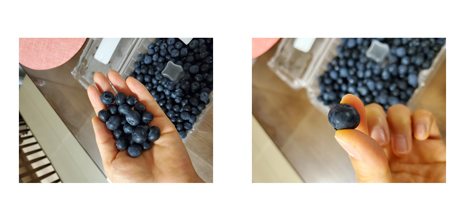 좋은 블루베리는 진한 청색이 선명하며 과실잎면이 팽팽하고 균일하게 흰 가루가 있는 것이 좋다고 합니다.